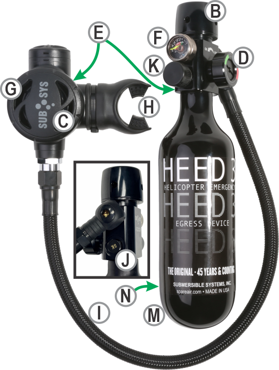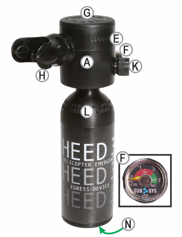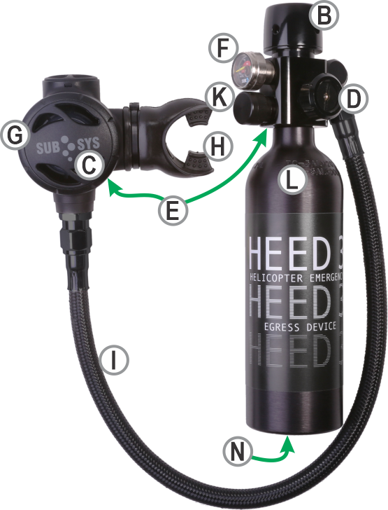 A Regulator Body - Our simple rugged design utilizes the same time proven technology found in typical regulators used by SCUBA Divers around the world. Our always-on, breathe on demand, balanced single stage regulator is easy to use, maintain and service. HEED 3 can be used in any orientation, even upside down.